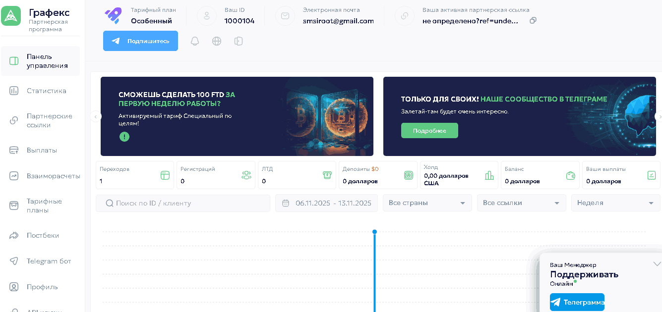 Affiliate.graphex.pro - криптопартнерка, которая предлагает рекламировать криптобиржу Graphex.pro. Здесь можно зарабатывать по следующим моделям RevShare, Hybrid, CPA, сумма отчислений зависит от количества FTD. Показатель отчислений зависит от успеха реклама кампани. Принимаются разные источники трафика TikTok, push, FB и пр. Можно участвовать и в реферальной программе с выплатой от 1% активности каждого реферала, но в дальнейшем процент повышается. Вывод средств осуществляется на криптокошельки раз в неделю.