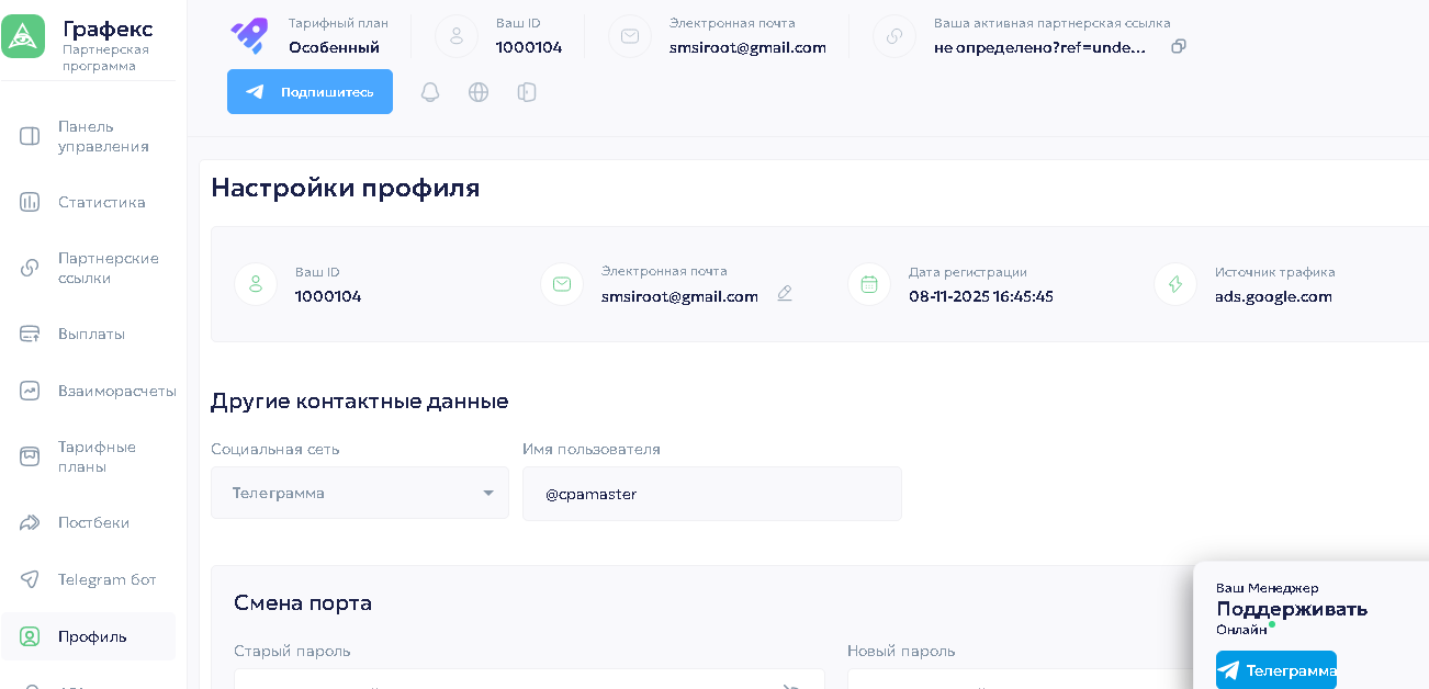 На главной странице нужно кликнуть "Стать партнером" и заполнить форму, где указать email, Telegram, придумать надежный пароль, указать источник трафика. После активации аккаунта необходимо зайти в личный кабинет и изучить меню. На главной странице сразу есть окно для оперативной связи с менеджером в онлайн режиме. Сразу предоставляются актуальные статистические данные: переходы, холд, выплаты, баланс. На панели инструментов доступны такие вкладки: