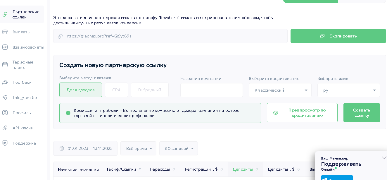 В разделе "Статистика" будет указана информация по переходам, регистрации, депозита, сделкам. Информацию можно отфильтровать по месяцам, неделям, по схеме сотрудничества.