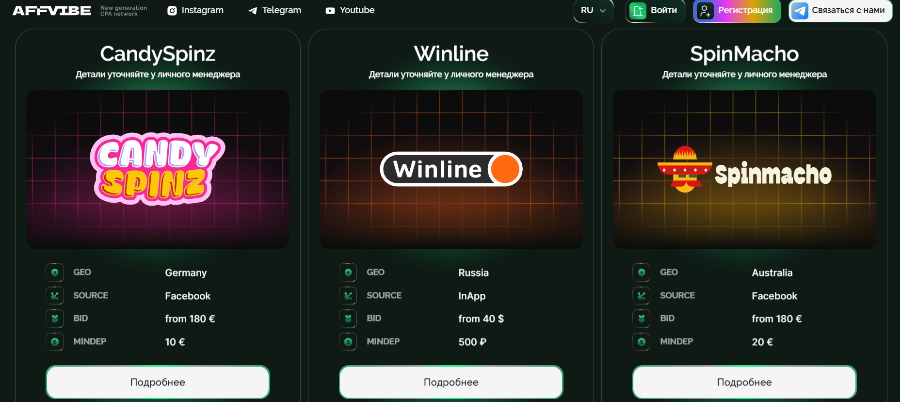 500+ офферов в каталоге проекта, среди которых WinLine, SpinMacho, CandySpinz и другие