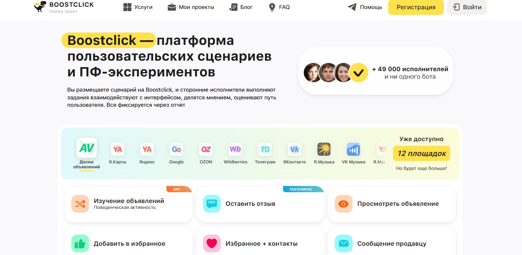 Boostclick.ru – российская биржа простых заданий и одновременно сервис продвижения услуг и товаров. На платформе клиенты могут заказывать выполнение своих сценариев, а исполнители – зарабатывать на них деньги. Биржа работает с такими площадками, как WB, VK, Ozon, Яндекс.Маркет, Telegram, Google, Yandex, а также с популярными досками объявлений и этот список будет пополняться в перспективе. На платформе работают только живые исполнители. Среди наиболее популярных типов заказов – просмотр объявлений, составление и публикация отзывов, переходы по ссылкам, добавление в избранное, написание сообщений.