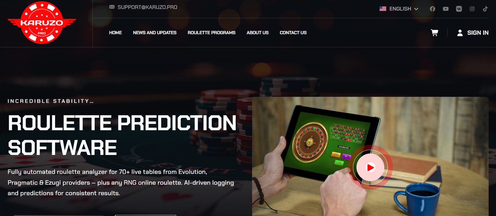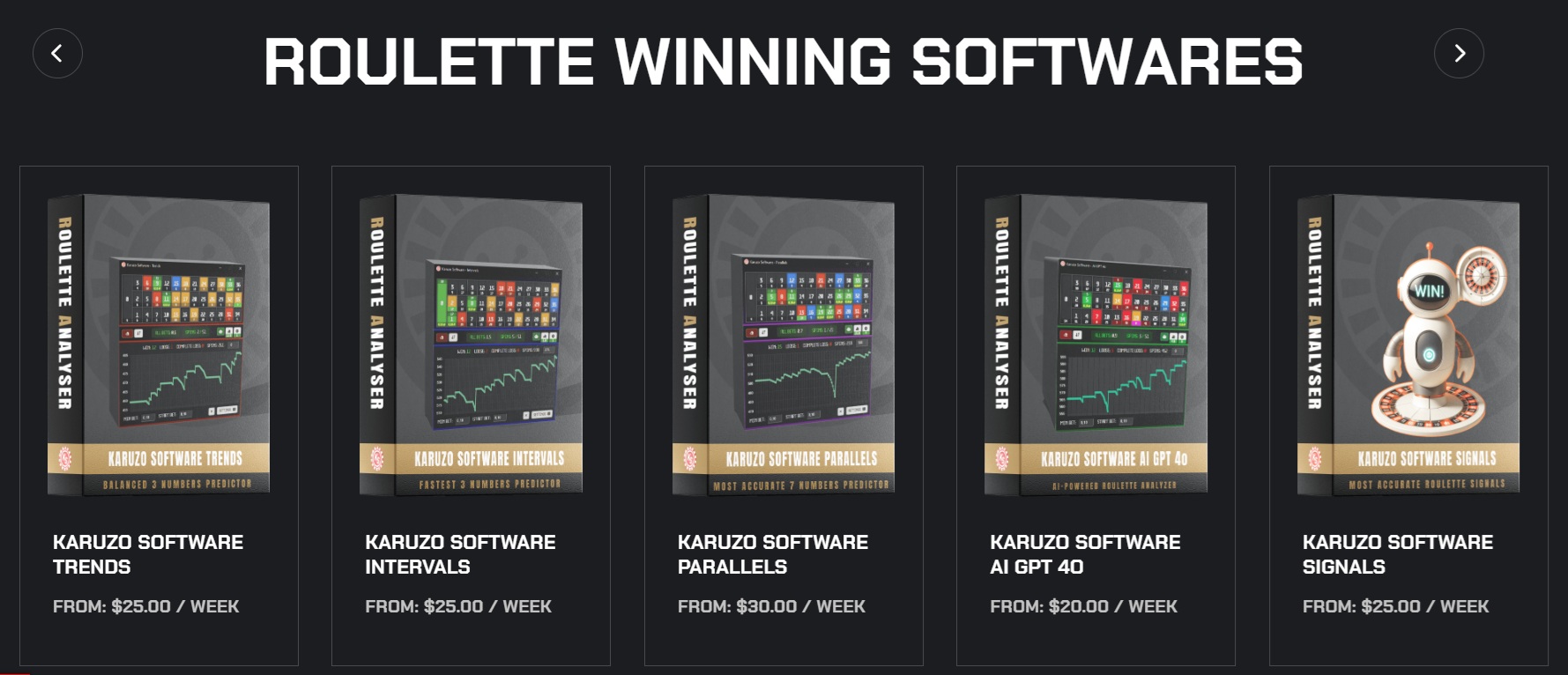 Karuzo.pro – сервис, который предлагает программное обеспечение для прогнозирования результатов рулетки. Проект был открыт в 2018 году. Работает на базе искусственного интеллекта. Продукты сервиса в первую очередь подходят для слотов от провайдеров Ezugi, Evolution, Pragmatic; но также могут использоваться и для любых иных онлайн-рулеток с генераторами случайных чисел. Помимо анализатора платформа предлагает автокликер и дополнительные утилиты (трекеры, калькуляторы и регистраторы статистики). Наибольшую эффективность продукты демонстрируют при прогнозировании игр на 3 числа. Скорость анализа составляет 15-20 вращений, а максимальная точность может достигать 96%. Для новичков доступна бесплатная пробная версия.