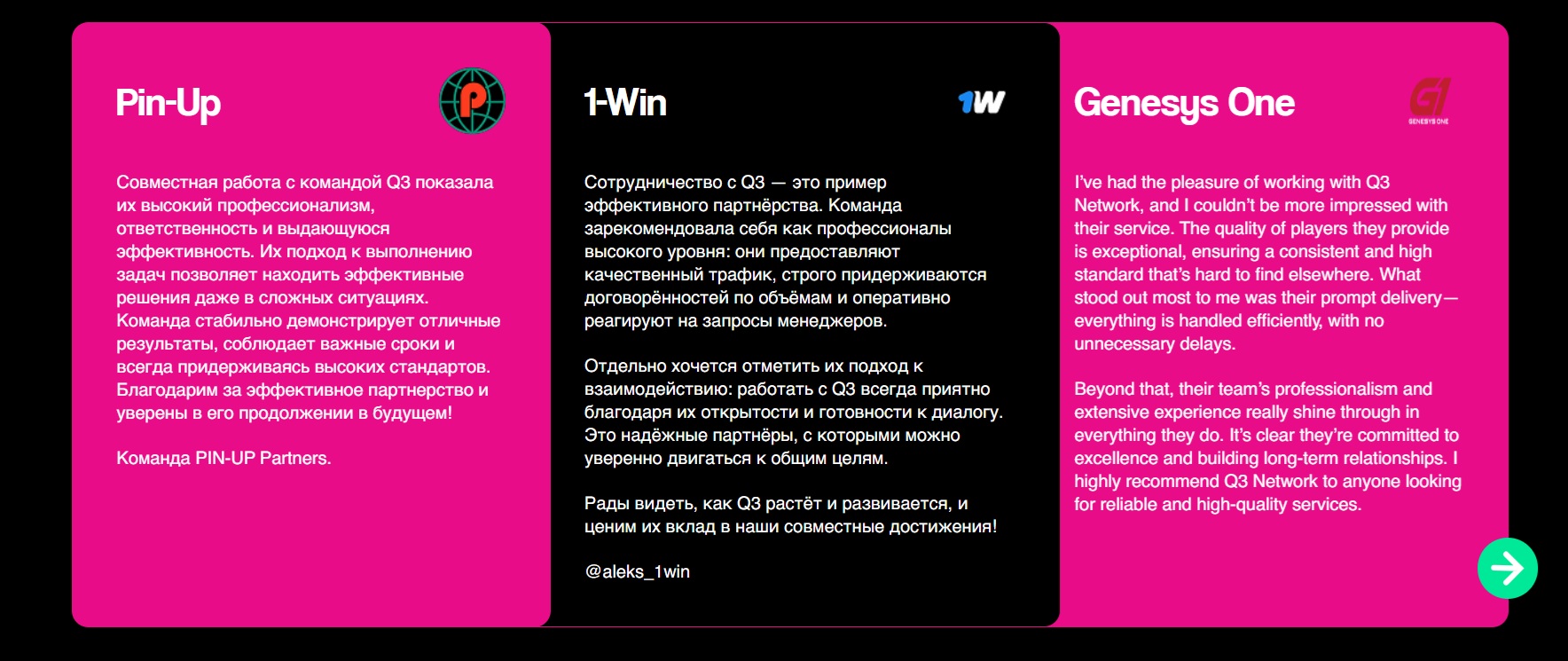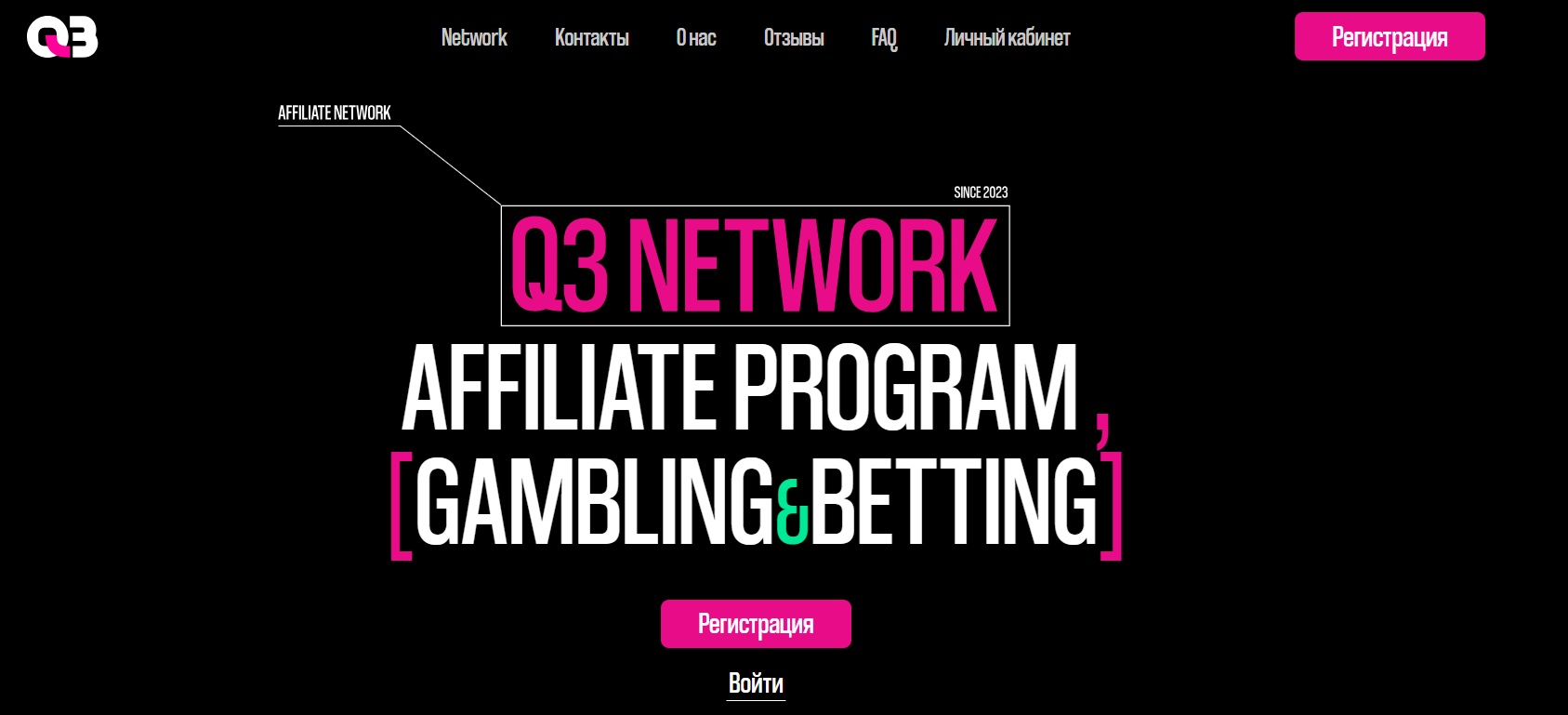 Q3.network – партнерская программа в нишах гэмблинга и беттинга. Работает с 2021 года. Действующие модели оплаты – RevShare со ставками 20-55%, CPA с выплатами от 100 до 450 долларов за лид и Hybrid. Оптимальный комиссионный план подбирается индивидуально с учетом гео, источника трафика и оффера. Выплаты проводятся с разной частотой: один раз в две недели или один раз в месяц. Чтобы получить заработанные средства, нужно накопить не менее 10 FTD. Единственный доступный платежный метод – криптовалюты (USDT TRC 20, USDT ERC 20). Проверенным партнерам проект предлагает эксклюзивные условия с повышенными ставками и ранним доступом к новым офферам. Запрещен схемный и мотивированный трафик.