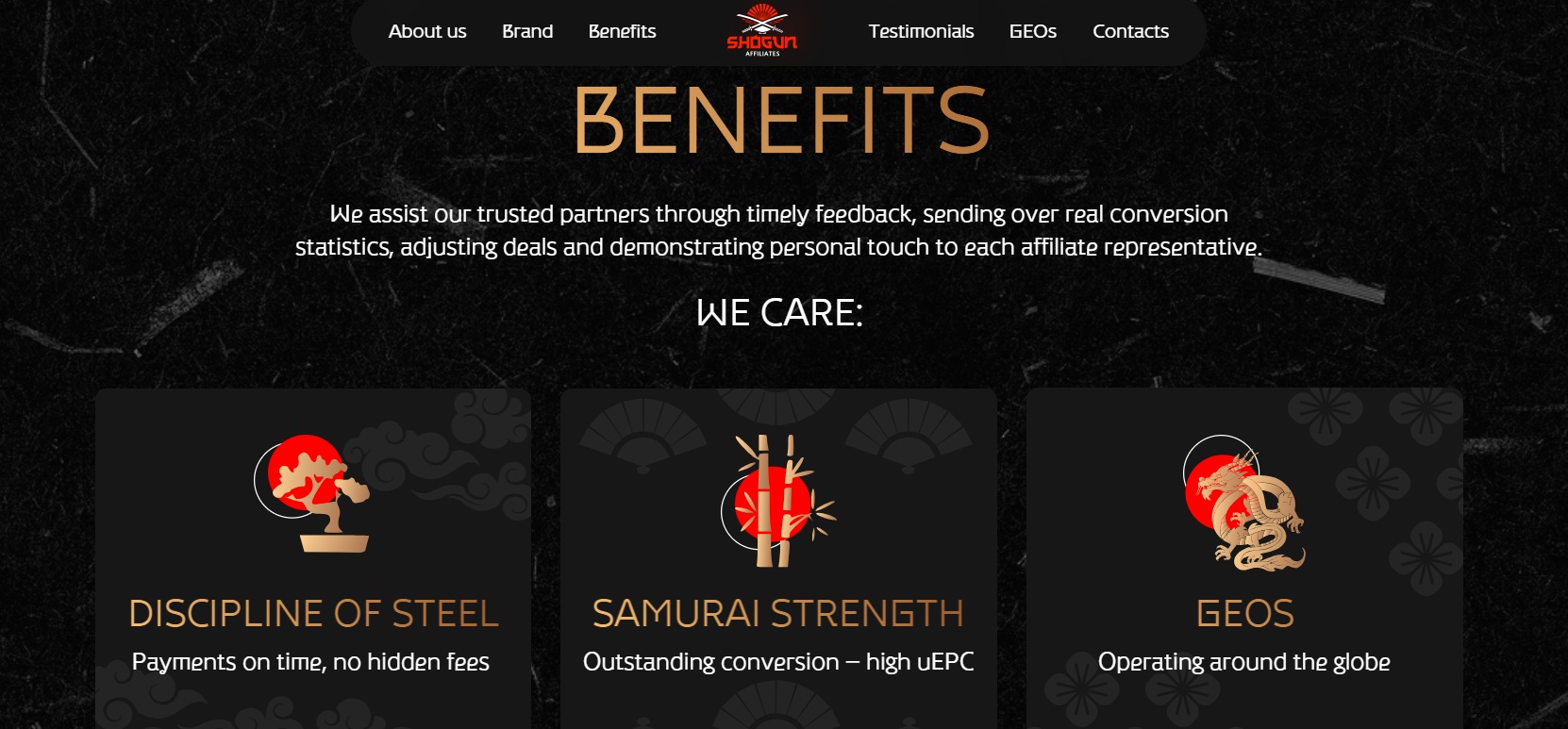Shogunaffiliates.com – партнерская программа в нише iGaming. Проект работает с 2025 года и продвигает три лицензированных бренда - Highflybet, TonySpins, Rodeoslot. Гео охват включает страны Tier I и Tier II. К системе можно подключиться, если вы работаете со следующими источниками трафика: FB, UAC, ASO, дорвеи, PPC, SEO. Остальные варианты – только по согласованию с менеджером. Заработанные деньги можно получать один раз в месяц при условии достижения минимальной суммы для вывода с размере 500 евро. В проекте запущена реферальная программа. Отрицательный баланс обнуляется каждый месяц.