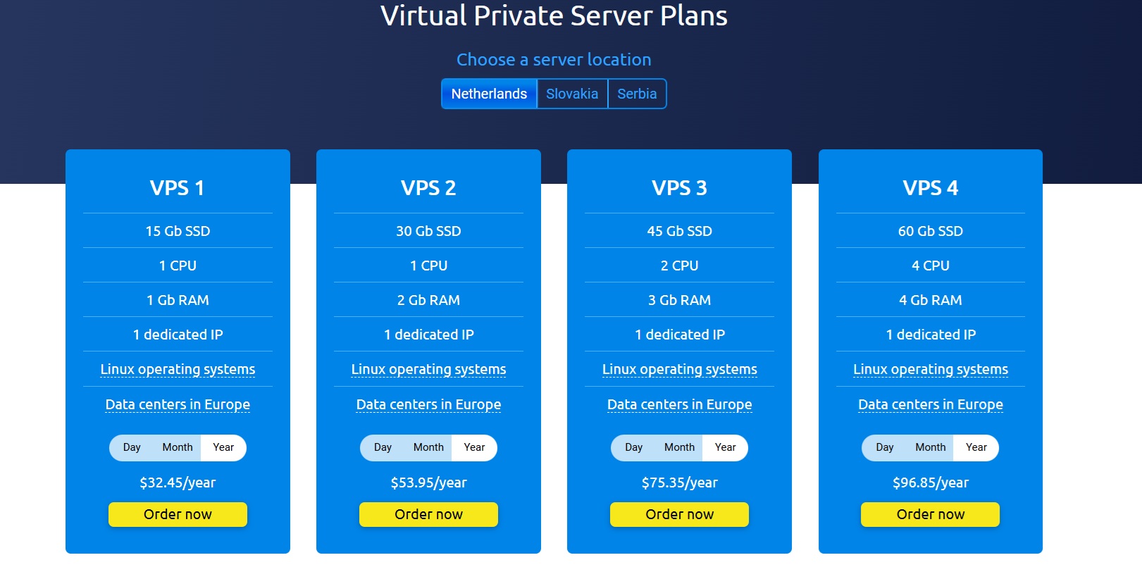 После регистрации в личном кабинете нужно выбрать тип VPS и местоположение ДАТА центра, а затем – один из предложенных тарифных планов. В каждой линейке предусмотрено четыре пакета и доступно три гео-локации на момент составления обзора.